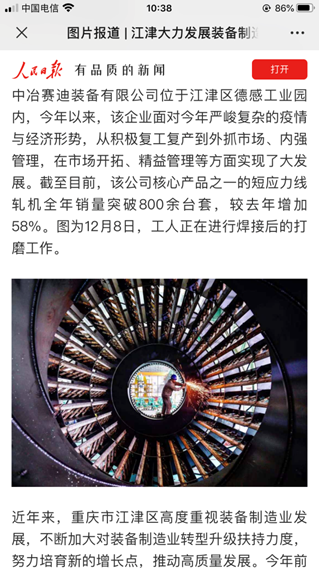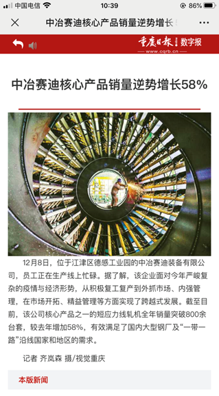 面對公司良好的發(fā)展勢頭,各路媒體紛至沓來,爭相報(bào)道。重慶衛(wèi)視新聞聯(lián)播以《中冶賽迪:技術(shù)創(chuàng)新推動數(shù)字化轉(zhuǎn)型》為題,著重報(bào)道了賽迪裝備“產(chǎn)品化”和科技創(chuàng)新成果;人民日報(bào)以《江津大力發(fā)展裝備制造業(yè),助推高質(zhì)量發(fā)展》為題,重點(diǎn)介紹了賽迪裝備在精益管理、市場開拓上的重大突破;重慶日報(bào)也推出《中冶賽迪核心產(chǎn)品逆勢增長58%》的報(bào)道,展現(xiàn)賽迪裝備在今年復(fù)雜形勢下實(shí)現(xiàn)的跨越式發(fā)展。,