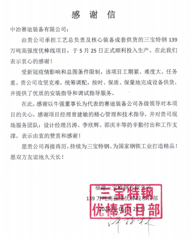 5月25日,賽迪裝備收到福建三寶特鋼有限公司發(fā)來的感謝信,信中對賽迪裝備牛強(qiáng)董事長為代表的各級領(lǐng)導(dǎo),項目經(jīng)理曾建敏,設(shè)計經(jīng)理呂濤、李欣輝、邵慶豐等的辛勤付出和工作支撐,表示由衷的贊賞和感謝,對賽迪裝備的技術(shù)能力、產(chǎn)品質(zhì)量和團(tuán)隊精神給予高度認(rèn)可與肯定。
