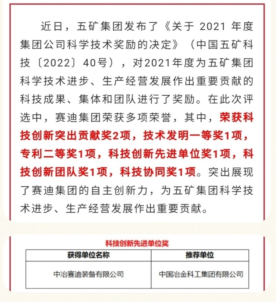 近日,五礦集團印發(fā)了《關于 2021 年度集團公司科學技術獎勵的決定》(中國五礦科技〔2022〕40號)文件,賽迪裝備榜上有名,榮獲2021年度五礦集團科技創(chuàng)新先進單位。