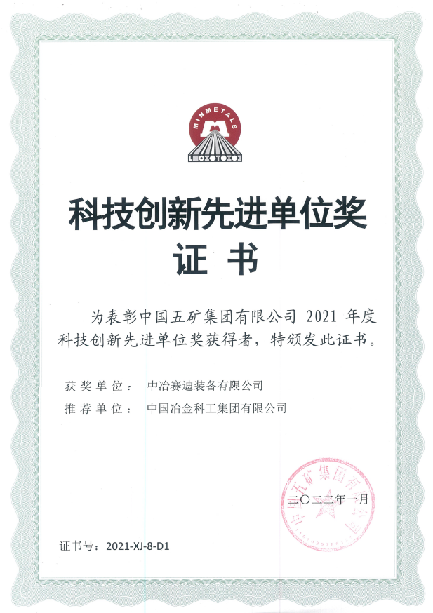 在近期召開的中國五礦集團科技創(chuàng)新大會上,五礦集團對為集團公司創(chuàng)新發(fā)展做出突出貢獻的集團和個人進行了表彰,并授予賽迪裝備“2021年度五礦集團科技創(chuàng)新先進單位”稱號。