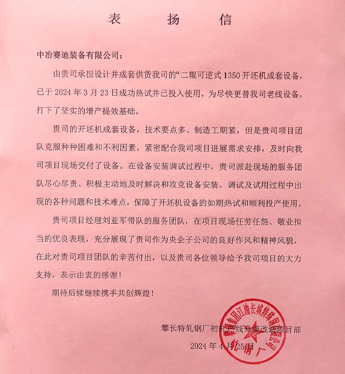 4月25日,一封來自攀鋼集團(tuán)江油長(zhǎng)城特殊鋼有限公司的表?yè)P(yáng)信,言辭懇切對(duì)中冶賽迪裝備在初軋產(chǎn)線二輥可逆式1350開坯機(jī)升級(jí)改造項(xiàng)目中作出的突出貢獻(xiàn)及項(xiàng)目團(tuán)隊(duì)的優(yōu)異表現(xiàn)給予高度肯定。