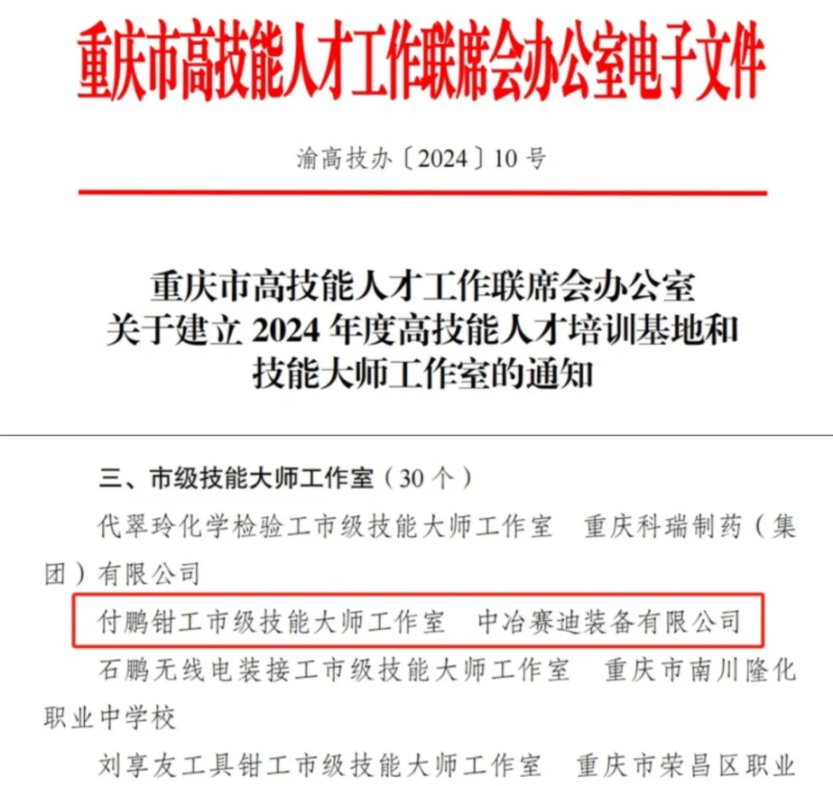 9月24日,重慶市高技能人才工作聯(lián)席會辦公室下發(fā)《關(guān)于建立2024年度高技能人才培訓(xùn)基地和技能大師工作室的通知》,賽迪裝備申報的“付鵬鉗工市級技能大師工作室”成功獲批建設(shè)。技能大師工作室由重慶市委組織部與重慶市人力資源和社會保障局聯(lián)合組織建立,本次成功獲批是對公司技能人才培養(yǎng)工作的認可和支持,為公司今后的高技能人才隊伍建設(shè)提供了更加堅實的政策保障。